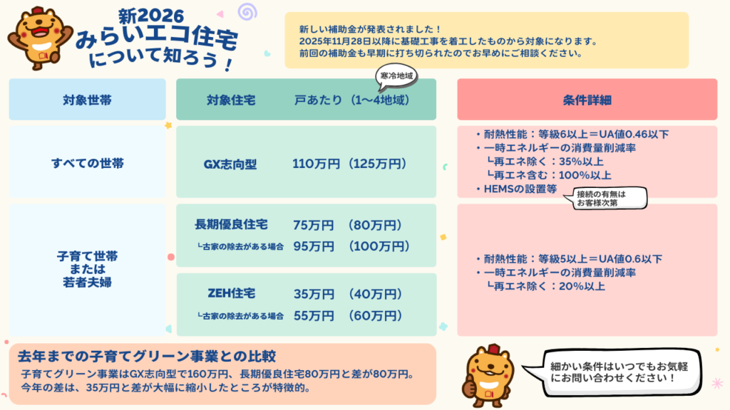 これまで行われていた「子育てグリーン住宅支援事業」の後継にあたり、2026年以降の家づくりの“基本ルール”のような位置づけになっています。