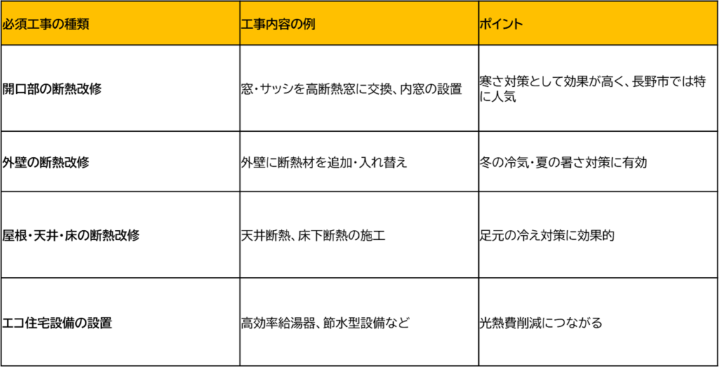 そして、みらいエコ住宅2026のリフォーム補助金を利用するには、下記の「必須工事」のいずれかを含めることが条件となります。